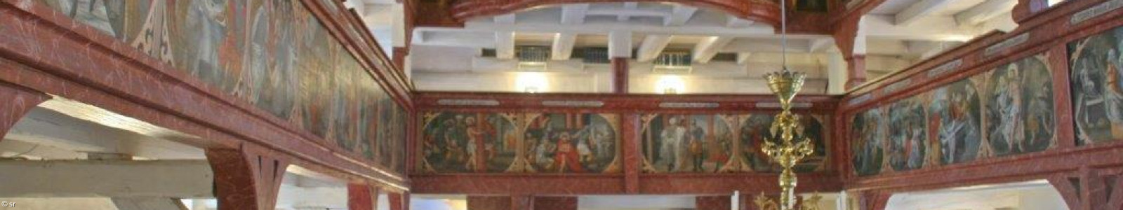 Zwei Emporen, deren Brüstungen mit 52 Motiven aus dem Leben Jesu prächtig bemalt sind, und die großartige, ebenfalls farbig bebilderte Decke – ein Tonnengewölbe -  beeindrucken den Besucher.